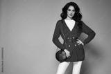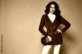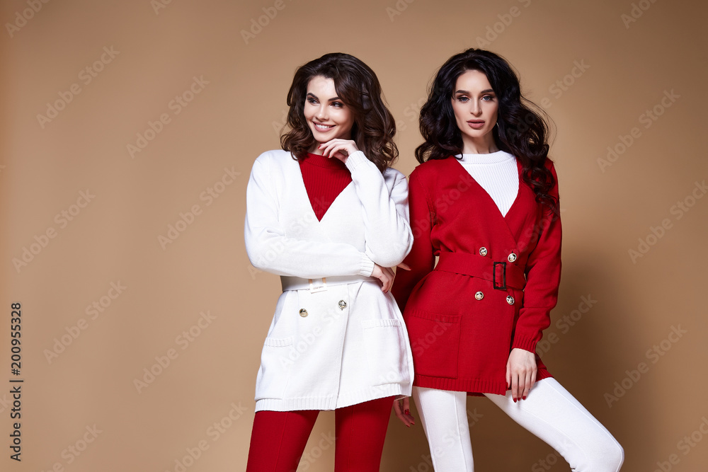 Sexy beautiful woman fashion glamour model brunette hair makeup wear knitted sweater green trousers clothes for every day casual party style jewelry date walk girlfriend skinny body shape studio.