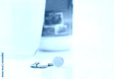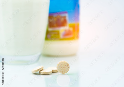 Sweetened flavored milk tablets and one glass of milk and milk bottle on white background. Calcium food products from cow milk for healthy bone.