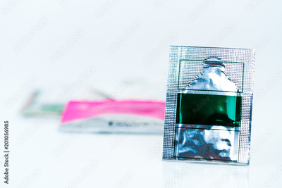 Mild steroid oral paste in aluminium foil sachet on blur background of sachets. Anti-inflammatory for oral mucous membrane, relief oral tenderness, pain, and ulceration. Aphthous ulcer or mouth ulcers