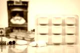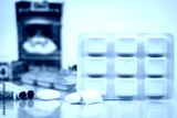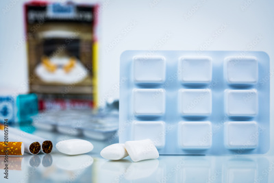 Nicotine chewing gum in blister pack on blurred background of cigarette pack. Medicine for giving up smoking. World no tobacco day concept.