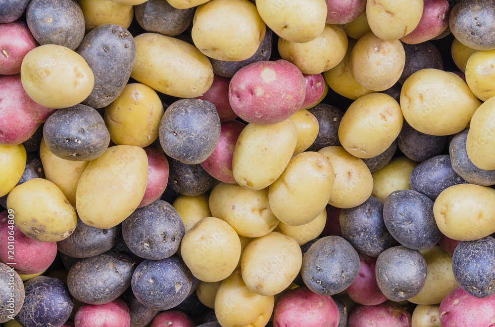 Close-up full frame view pile of organic mixed medley potatoes at farmer market. Assorted raw rainbow, tricolor mini potatoes background