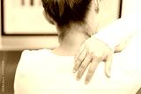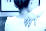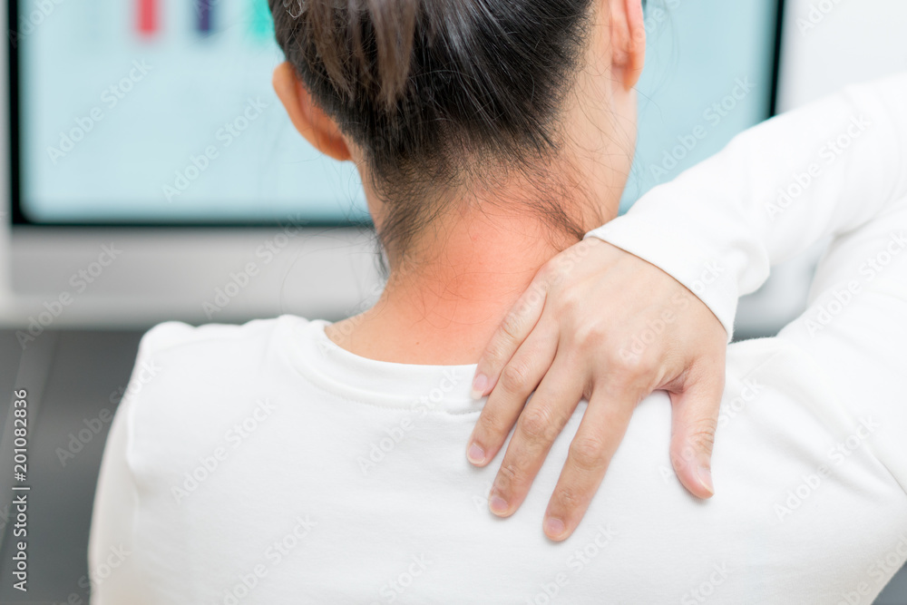 young women neck and shoulder pain injury with red highlights on pain area, healthcare and medical concept