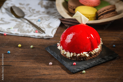 Sweet food, red chocolate cake and assorted macarons