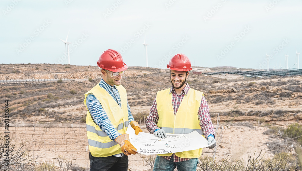 Workers engineers discussing renewable energy project