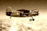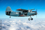 Aircraft turboprop biplane at high altitude in the sky above overcast with an open door.