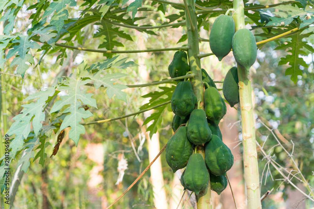 fresh green papaya tree with bunch of fruits on blurred backgrounds