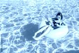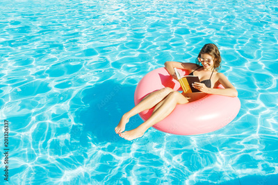 Beautiful happy woman reading a book with inflatable ring relaxing in blue swimming pool