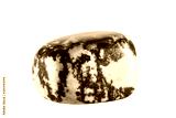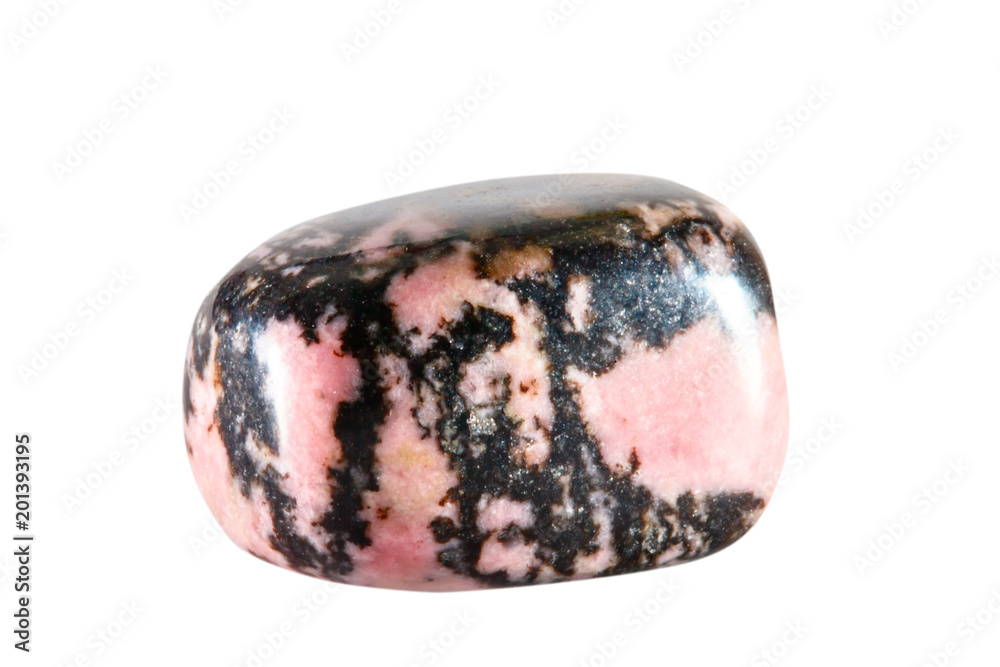 Macro shooting of natural gemstone. The raw mineral is rhodonite, China. Isolated object on a white background.