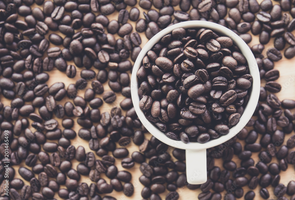 Close up of white coffee cup full of coffee beans background with copy space
