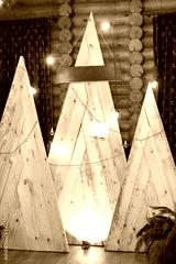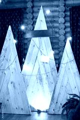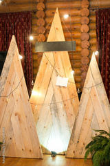 design, interior, holidays concept. three decorating elements placed by the wall of the restaurant hall, they are made of wood and look like christmas trees, embellished with lights