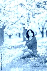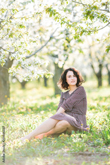 picnic, weekends, holidays concept. in the soft light of spring sun there is an awesome woman hidden in the shadows of beautiful trees with white flowers