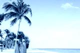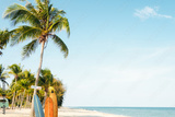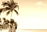 Landscape of coconut palm tree on tropical beach in summer. beach sign for surfing area. Vintage effect color filter.