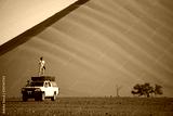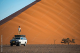 Young Asian man traveler and photographer standing on camper car near orange sand dune. Travel desert concept