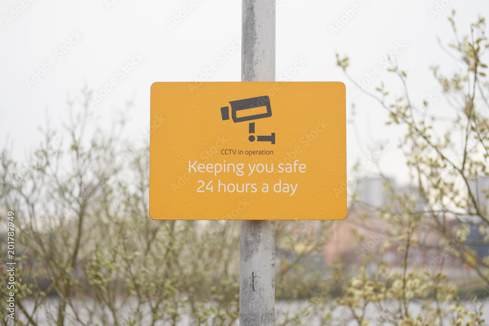 CCTV in operation sign 24 hours a day keeping you safe security sign post orange minimal