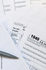 The pen and notebook is lies on the tax form 1040 U.S. Individual Income Tax Return. The time to pay taxes