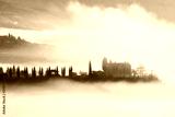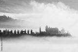 Beautiful foggy sunrise in Tuscany, Italy with cypresses and house. Natural misty background in black and white