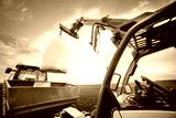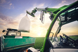 crane puts sack with fertilizer on trailer in field in spring