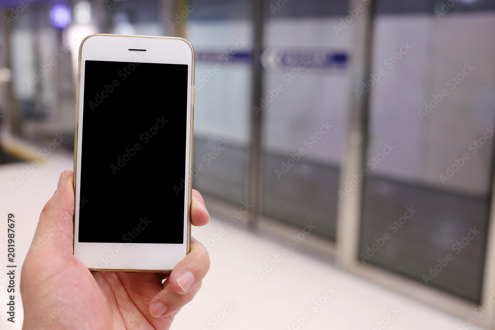Hand holding white mockup smartphone with subway station background