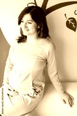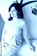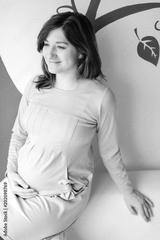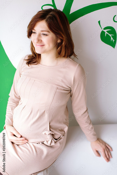 pregnancy, happiness, childbirth concept. against the wall with greeny patterns of leaves there is a smiling woman with midle haircut, light shining complexion, dressed in gorgeous cremy dress