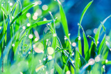 Artistic beautiful image of green grass with dew water droplets early spring morning in the sunlight. Nature concept. Macro image with selective focus.