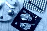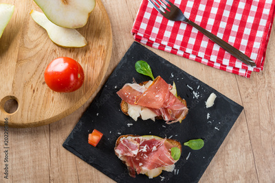 Bruschetta with prosciutto, cheese and pear
