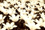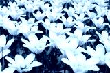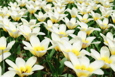 Field of white tulips, floral pattern, open buds like stars, top view