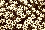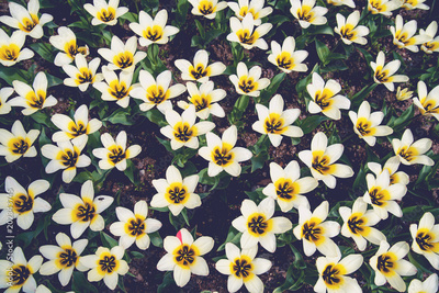 Field of white tulips, floral pattern, open buds like stars, top view