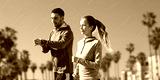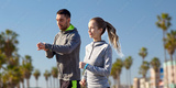 fitness, sport and healthy lifestyle concept - smiling couple with heart-rate watches running over venice beach background in california