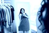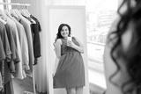 clothing, fashion and people concept - happy plus size woman in pink dress taking at mirror selfie by smartphone at home