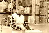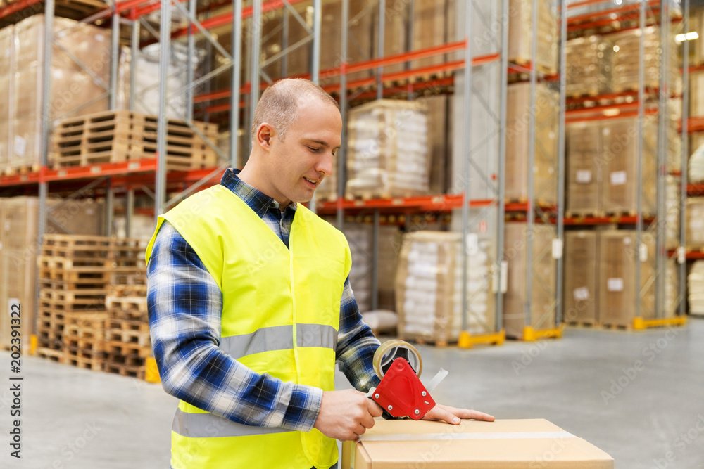 logistic business, shipment and people concept - worker in safety vest packing parcel box with scotch tape at warehouse or mail storage