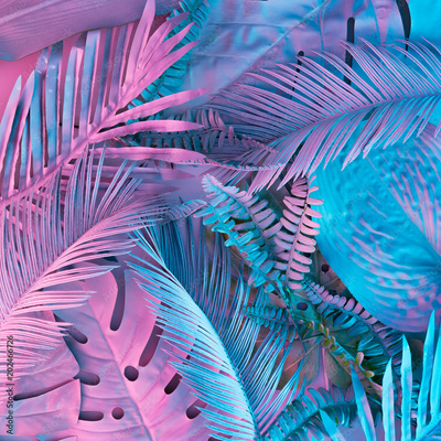 Tropical and palm leaves in vibrant bold gradient holographic neon colors. Concept art. Minimal surrealism background.