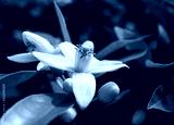 Neroli. Green bright orange tree leaves and orange flower neroli with raindrops, dew background