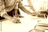 Close-up Of Person's engineer Hand Drawing Plan On Blue Print with architect equipment, Architects discussing at the table, team work and work flow construction concept