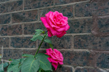 Bright pink roses in full bloom against old brick wall