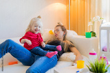 Exhausted mom fallen asleep on couch