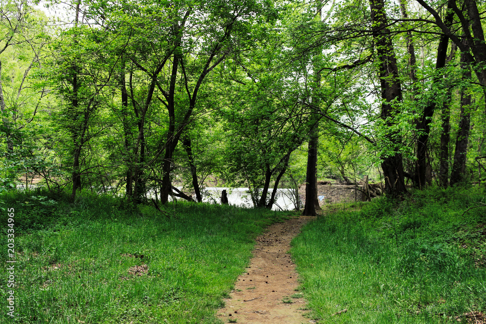 Forest trails by waterfall