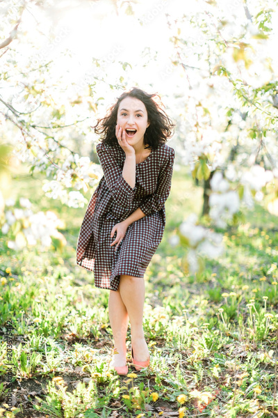 pin up, natural, celebrity concept. concept. there is a charming woman surrounded by blooming apple trees, she looks like black haired marilyn monroe, her radiand smile is shining