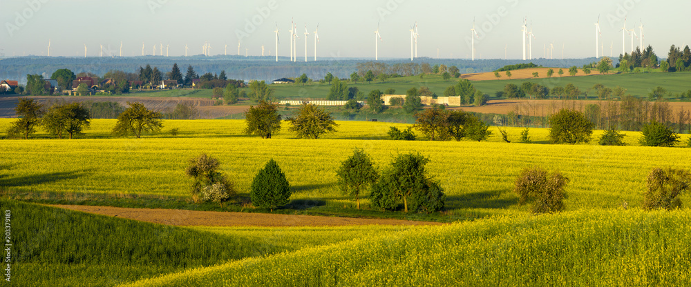 panorama of spring rural landscape. Green fields of young grain and green trees in the field