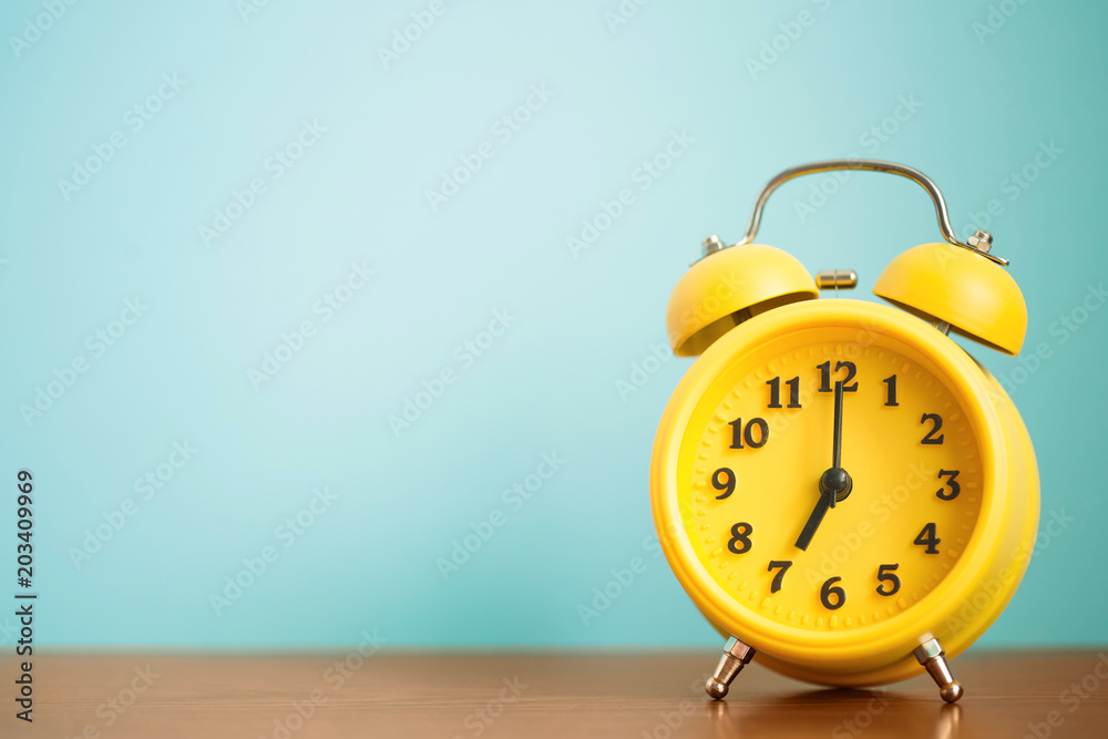 yellow alarm clock seven o'clock in the morning on the table against the blue wall. time for people to get to work, for kids to school