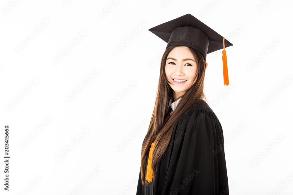 Beautiful Attractive Graduate Asian woman in cap and gown smile feeling so proud and happiness,Isolated on white background,Education Success Concept