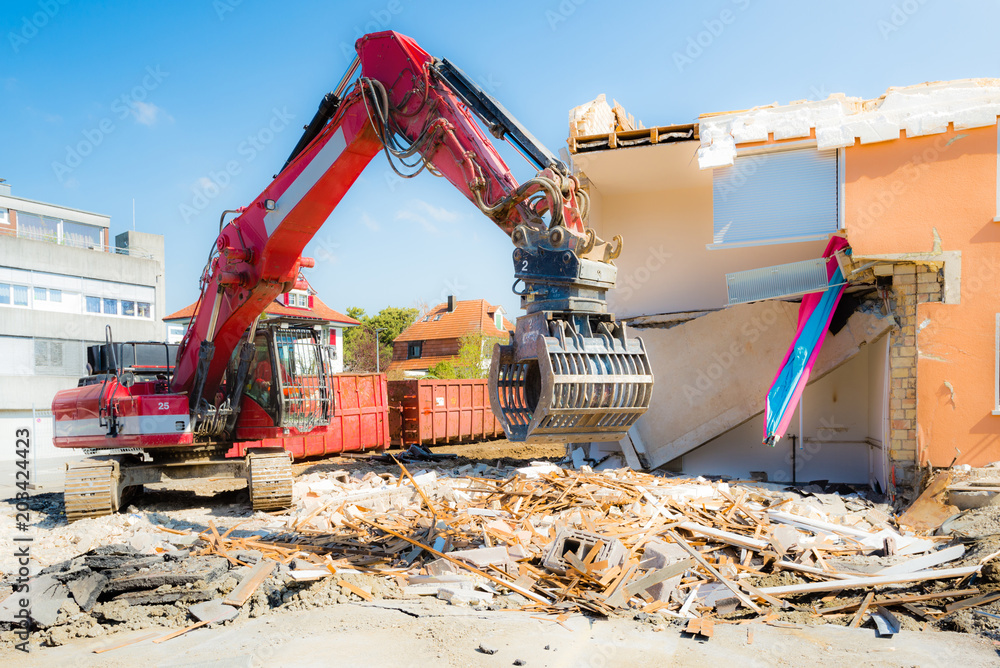 Tabula rasa, Abriss und Neuanfang, Bagger reisst altes Haus ab und macht Platz für Neues