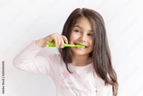 Little cute child girl brushing her teeth on white background. Space for text. Healthy teeth.