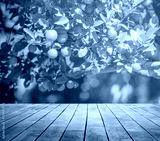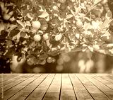 wooden desktop background and orange trees with fruits in sun light