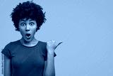 Photo of greatly surprised dark skinned female with bushy Afro haircut, wears casual t shirt, indicates at yellow blank copy space, keeps mouth widely opened, being astonished with something.
