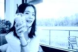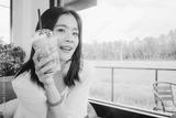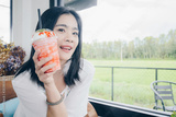 Portrait of asian woman holding a cup of Iced strawberry frappe on her hand.