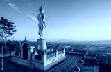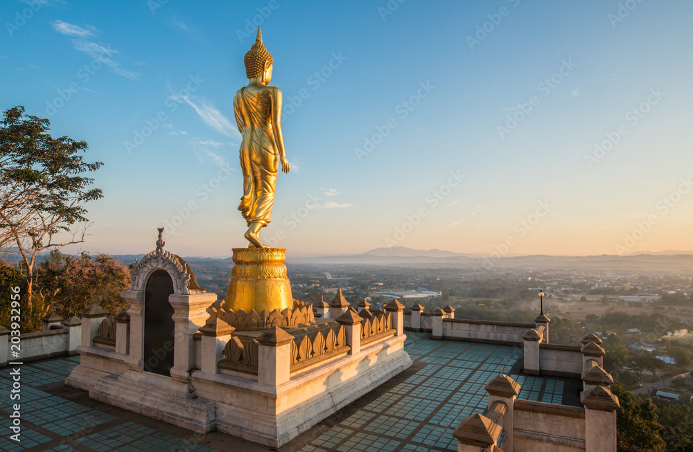 The iconic standing Buddha on Wat Phra That Khao Noi one of the most tourist attraction places in Nan province of northern Thailand during the sunrise.