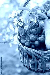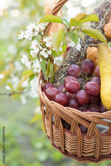 healthy lifestyle, spring, harvesting concept. among appetizing fruits, pears and bunches of grapes, prepared for the picnic in wicker basket there are flowers of blooming apple tree