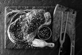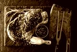Marbling ribeye steak on black plate. Prime rib beef chop