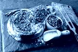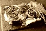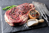 Marbling ribeye steak on black plate. Prime rib beef chop