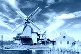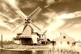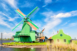 Dutch typical landscape. Traditional old dutch windmills with house and swan against blue sky in the Zaanse Schans village, Netherlands. Famous tourism place.